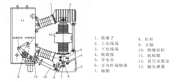 進口滅弧室的觸頭開距西門子公司為8±1mm(31.5kA、40Ka);美國西屋公司為8 mm(31.5kA);8±1mm(40kA)。·總體結(jié)構(gòu)圖(真空斷路器3AF型(ZN12-12系列))